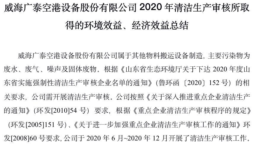 威海广泰空港设备股份有限公司2020年清洁生产审核所取得的环境效益、经济效益总结威海广泰空港设备股份有限公司属于其他物料搬运设备制造,主要污染物为废水、废气、噪声及固体废物。根据《山东省生态环境厅关于下达2020年度山东省实施强制性清洁生产审核企业名单的通知》(鲁环函〔…